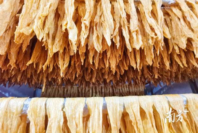 “难点就在于火候难掌控。腐竹二次包浆后晾晒至五六成干时,依‘古法’用炭火烘烤,温度要控制在80度左右,一旦超过就会影响品质。”周序山说道。