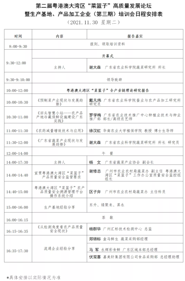 为贯彻落实国家关于粤港澳大湾区发展的重要战略部署,进一步推进粤港澳大湾区“菜篮子”工程建设,保证粤港澳大湾区“菜篮子”市场稳定供应,第二届粤港澳大湾区“菜篮子”高质量发展论坛暨生产基地、产品加工企业(第三期)培训会将于2021年11月30日在广州举办。会议有哪些重要内容,一起来看一下吧!