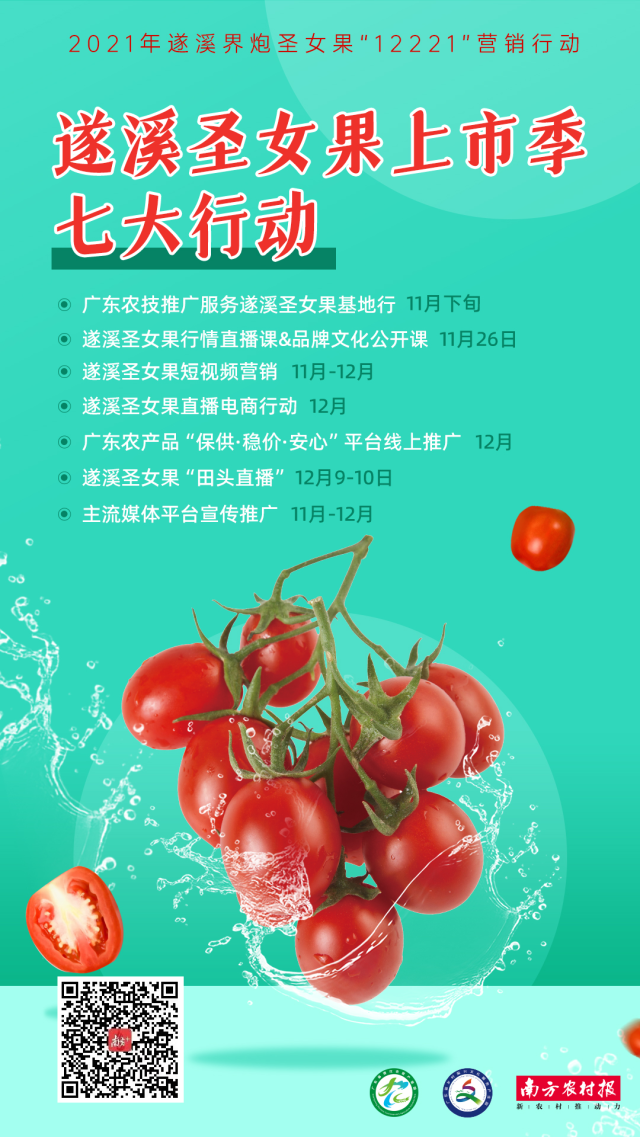 随着遂溪圣女果上市时间的接近,遂溪界炮圣女果“12221”营销行动也进入了紧锣密鼓的执行阶段。接下来一个月时间里,广东省乡村振兴文化服务产业园将组织开展遂溪圣女果上市季七大行动,广东农技推广服务遂溪圣女果基地行、遂溪圣女果短视频营销、遂溪圣女果电商推广、广东农产品“保供·稳价·安心”平台线上推、遂溪圣女果“田头直播”等活动将相继展开,为今年的遂溪圣女果上市销售“保驾护航”。