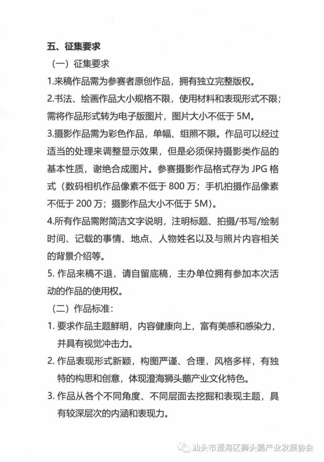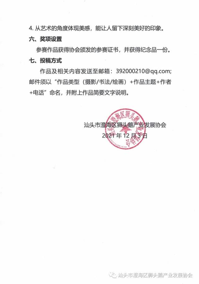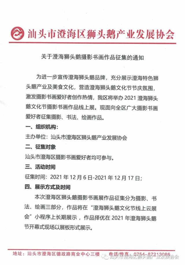 《通知》提到,本次摄影书画作品的形式分为摄影、书法、绘画三种,作品征集时间为12月6日-17日。届时,参赛作品将在面向社会大众的“澄海狮头鹅文化节线上云展会”小程序上长期展示。值得一提的是,参与本次征集活动的作品将获得由协会颁发的参赛证书及2021澄海狮头鹅文化节纪念奖品一份,优秀作品更有机会在2021澄海狮头鹅文化节开幕式现场展出。