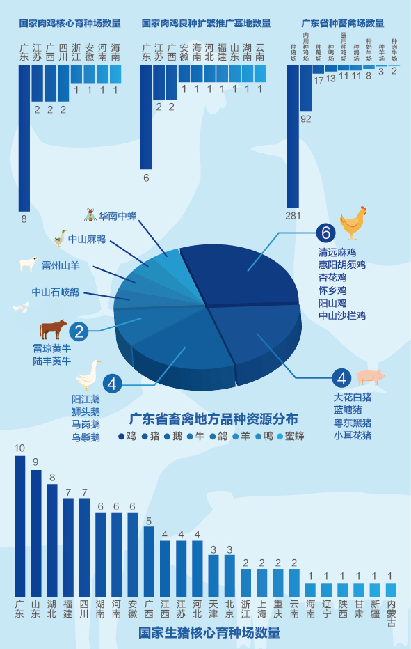 农以种为先,生猪良种选育是提升畜牧业核心竞争力的重要体现。广东不仅是生猪养殖大省,更是生猪种业大省。据统计,广东有种猪场272家,年产种猪236万头,约占全国的8%。广东有国家生猪核心育种场10家,国家级生猪保种场(区)2个,省级保种场(区)6个,生猪新品种(配套系)4个,形成了广东小耳花猪特色产业区产业带,种业创新能力拔群。