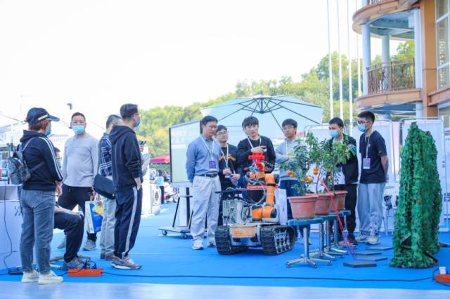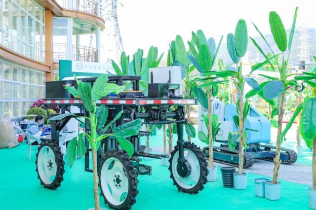 在隔壁,围观人群也发出阵阵赞叹。原来仲恺农业工程学院的农业机器人也开始实操,只见它缓缓伸出长长的机械臂,准确进行一串串香蕉采收演示,整个操作过程既精准又平稳。据仲恺学院相关负责人介绍,该款设备为山地林果采摘智能机器人,由仲恺农业工程学院机器人团队创新研发,能针对性解决丘陵山地林果采摘难问题。