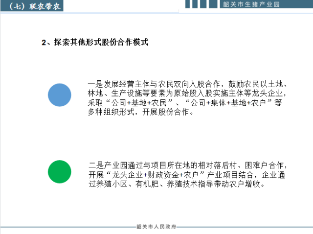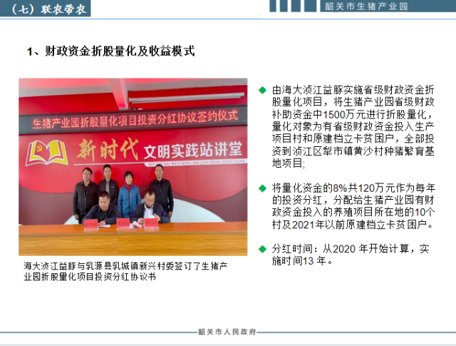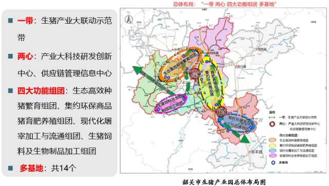 韶关市生猪产业园吸引海大集团、温氏股份、新希望集团、金新农集团等多家大型上市农牧企业集聚韶关,与本地生猪企业一道,发挥各自优势,共同建设21个项目。产业园总投资22亿元,其中省级财政资金1.5亿元,以集约高效、绿色环保、数字智能、生物安全、食品安全、紧密联农为发展理念,按照‘生产+加工+科技+品牌营销’模式,构建猪苗、饲料、养殖、屠宰、流通、动保产品完整产业链。拟将园区打造成为国家级现代化生猪产业示范区、华南地区生猪屠宰加工与冷链物流配送中心(大湾区生猪屠宰加工与冷链物流配送中心)、广东省产业扶贫示范区。”