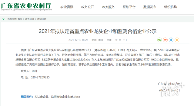 近日,广东省农业农村厅发布2021年拟认定省重点农业龙头企业和监测合格企业公示名单。经各地申报推荐、第三方综合审核、实地抽查复核、征求省相关部门(单位)意见,拟认定168家新申报企业为省重点农业龙头企业、149家企业监测合格,其中广州市启迪农业科技有限公司(下称“启迪农业”)入选。
