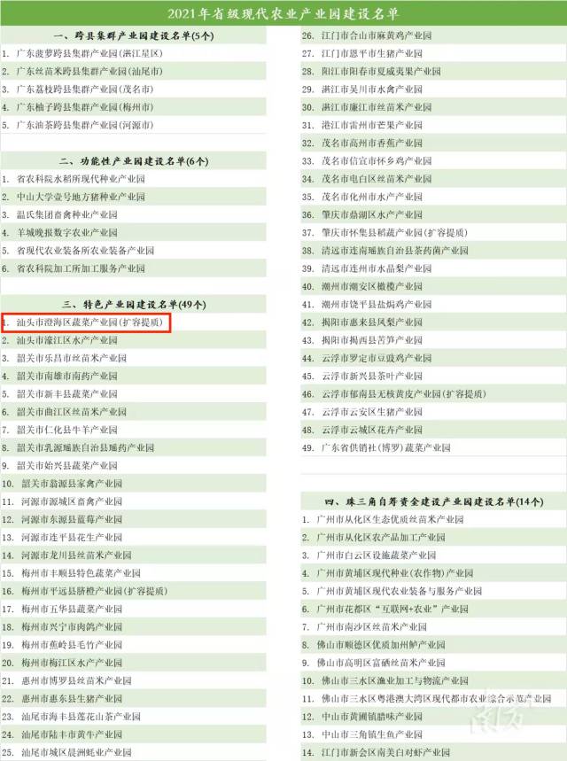 12月28日,广东省建设第二轮现代农业产业园新闻发布会在省农业农村厅召开,正式发布2021年省级现代农业产业园建设名单,共计74个产业园入选。其中,汕头市澄海区蔬菜产业园榜上有名,成功入选特色产业园建设名单,将在原有产业园建设基础上进行扩容提质,进一步做大做强。
