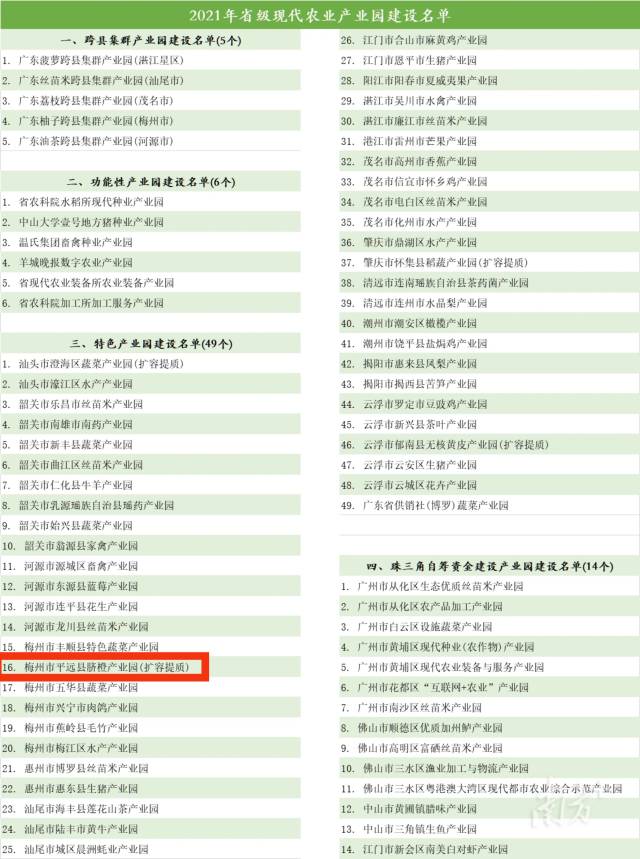 12月28日,广东省建设第二轮现代农业产业园新闻发布会在省农业农村厅召开,正式发布2021年省级现代农业产业园建设名单,梅州市平远县脐橙产业园顺利入选,将在原有建设基础上进行扩容提质。