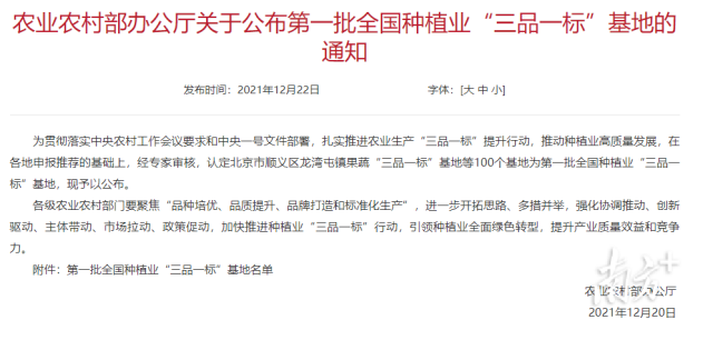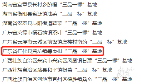 日前,农业农村部公布了第一批全国种植业“三品一标”基地名单,在各地申报推荐的基础上,经专家审核,广东省仁化县黄坑镇等贡柑“三品一标”基地等100个基地成功入选。