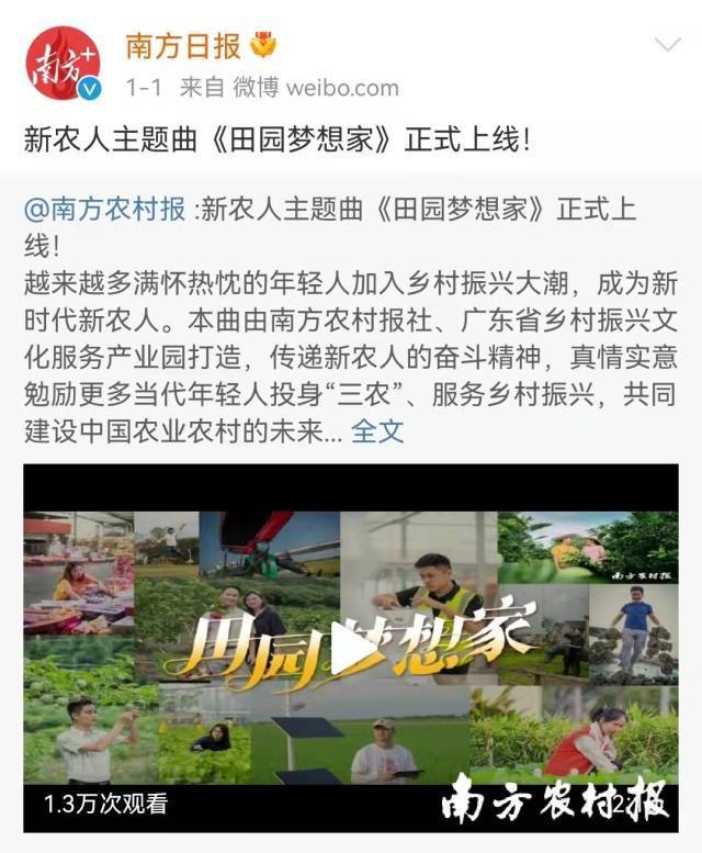 《田园梦想家》自发布以来,已先后上线网易云音乐、QQ音乐、酷狗音乐、酷我音乐、咪咕视频、抖音等各大平台,并通过南方+首页、微信视频号、新浪微博等主流社交平台打造影响力,得到南方日报等省级主流媒体转载,吸引广大网友的关注,用音乐的方式,向网友讲述一支新时代乡村振兴道路上冉冉升起的新生活力军。