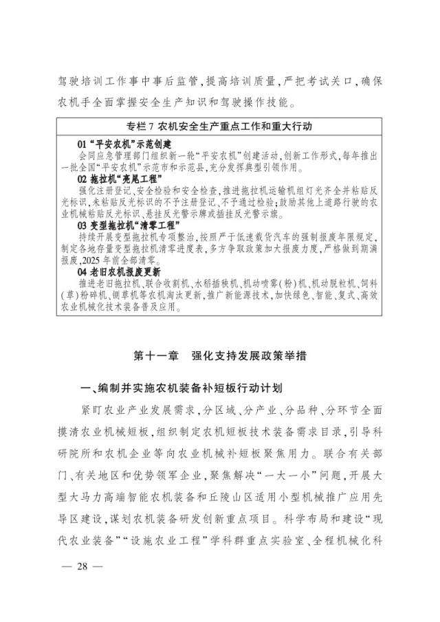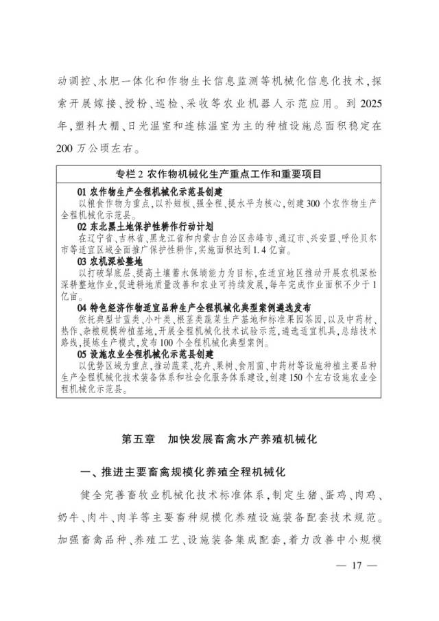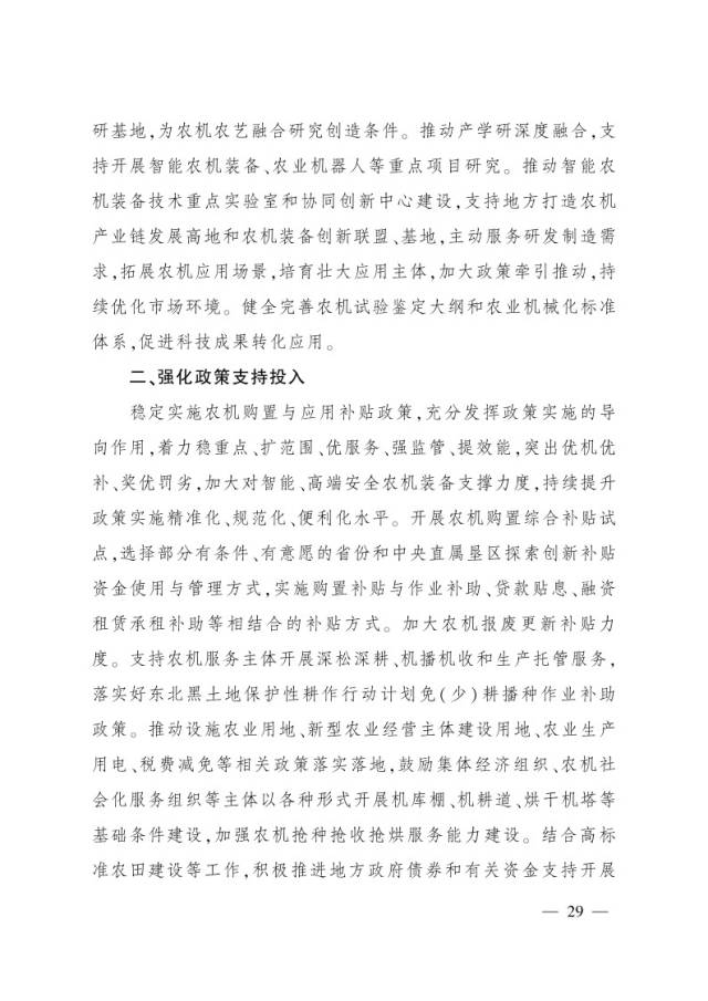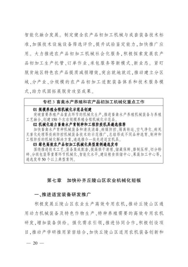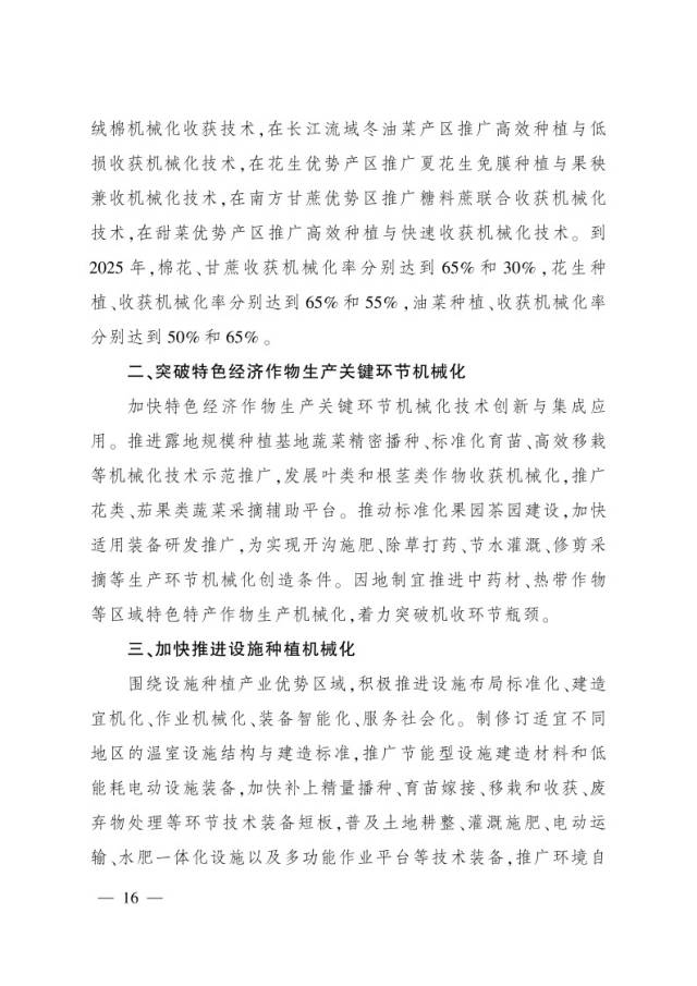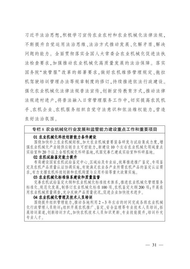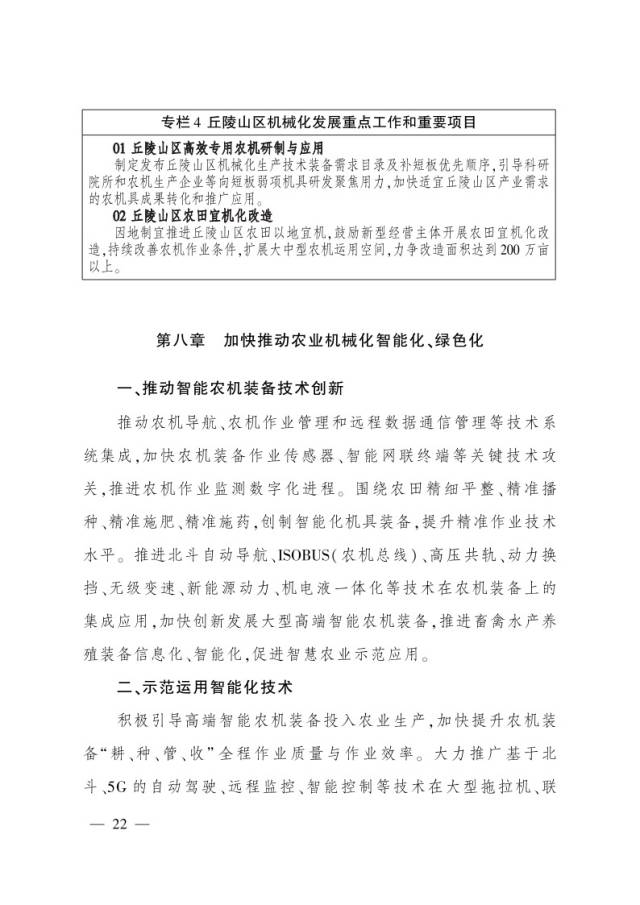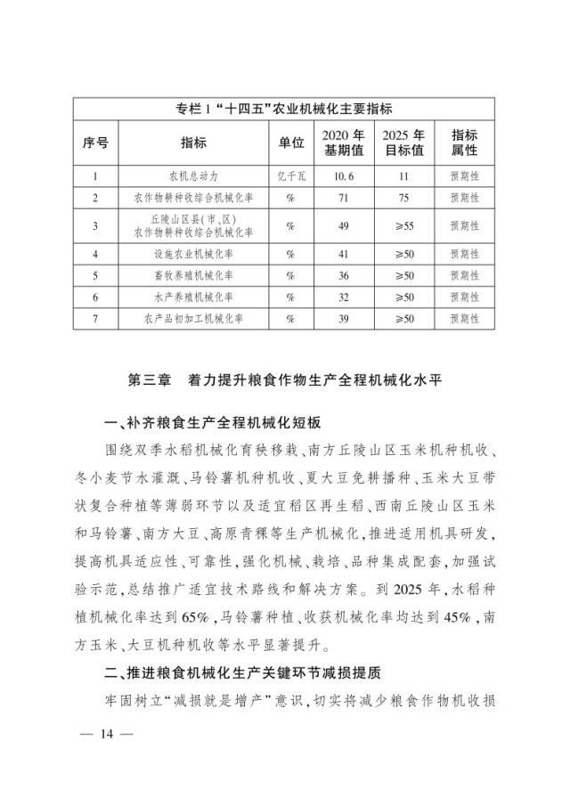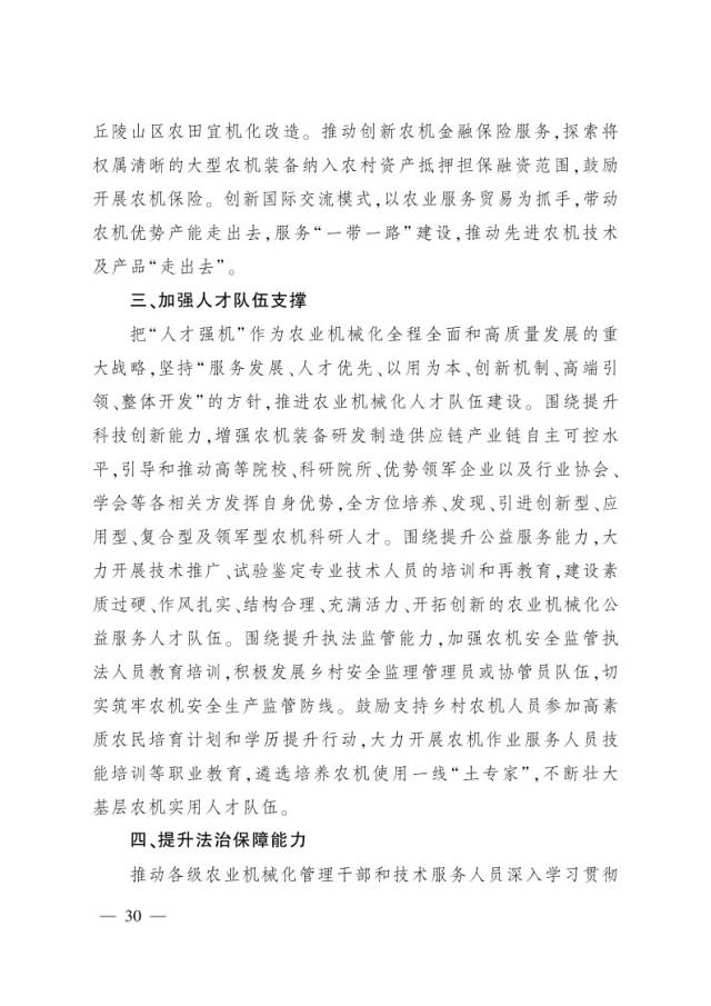 《规划》强调,要坚持围绕中心、服务大局,坚持政策扶持、市场主导,坚持创新驱动、协调发展,坚持系统谋划、协同推进,强化支持发展政策举措,着力提升粮食作物生产全程机械化水平、大力发展经济作物生产机械化、加快发展畜禽水产养殖机械化、积极推进农产品初加工机械化、加快补齐丘陵山区农业机械化短板、加快推动农业机械化智能化绿色化、做大做强农业机械化产业群产业链、切实加强农机安全管理。>>>文末附《“十四五”全国农业机械化发展规划》