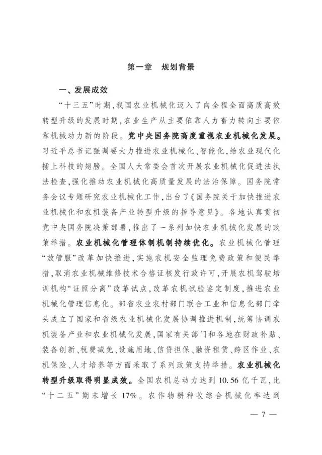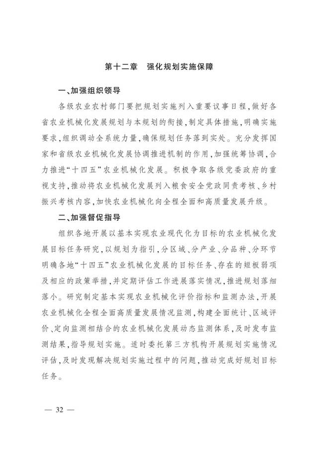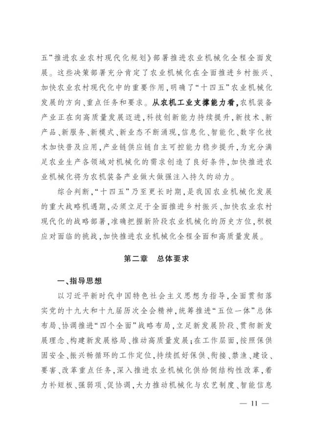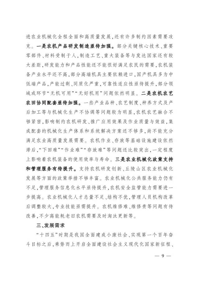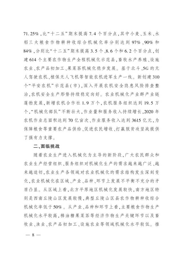 《规划》指出,我国农业生产已从主要依靠人力畜力转向主要依靠机械动力,进入了机械化为主导的新时期。“十四五”时期,三农工作进入全面推进乡村振兴、加快农业农村现代化的新阶段,对农业机械化提出了新的更为迫切的要求,也为农业机械化带来了新的发展机遇。要深入推进农业机械化供给侧结构性改革,着力补短板、强弱项、促协调,大力推动机械化与农艺制度、智能信息技术、农业经营方式、农田建设相融合相适应,引领推动农机装备创新发展,做大做强农业机械化产业群产业链,加快推进农业机械化向全程全面高质高效发展。