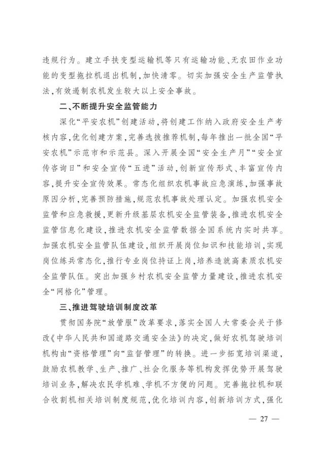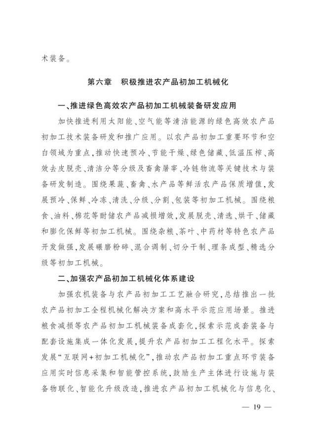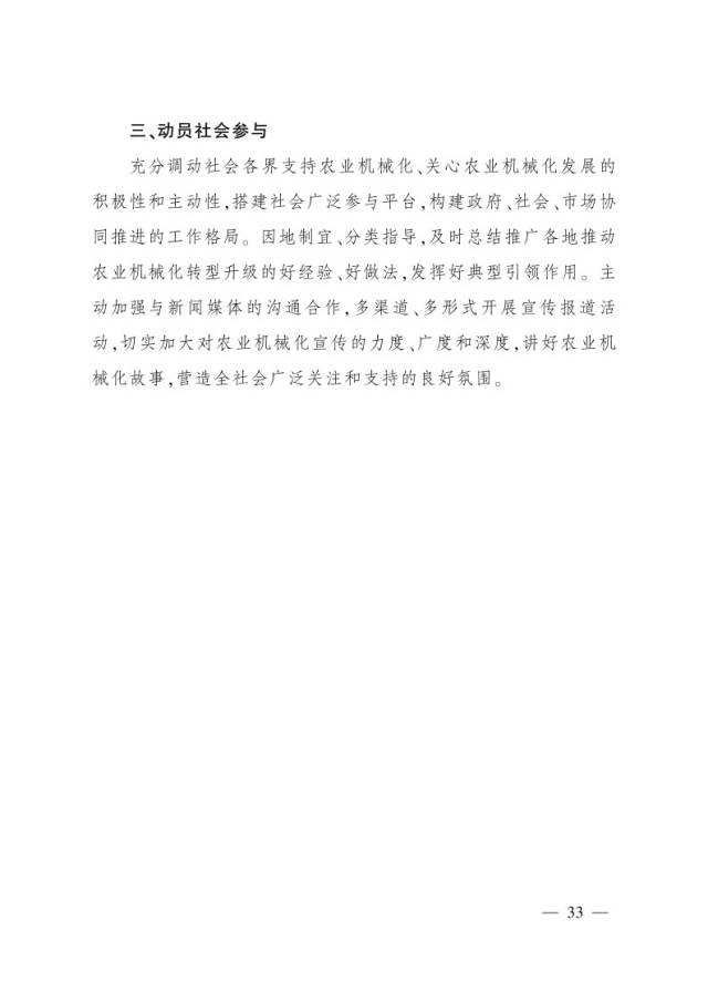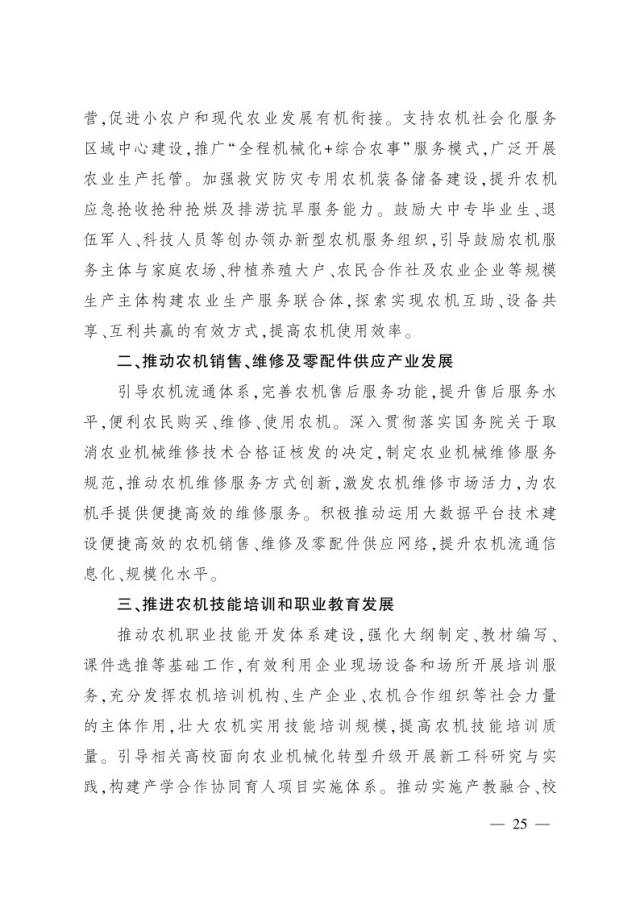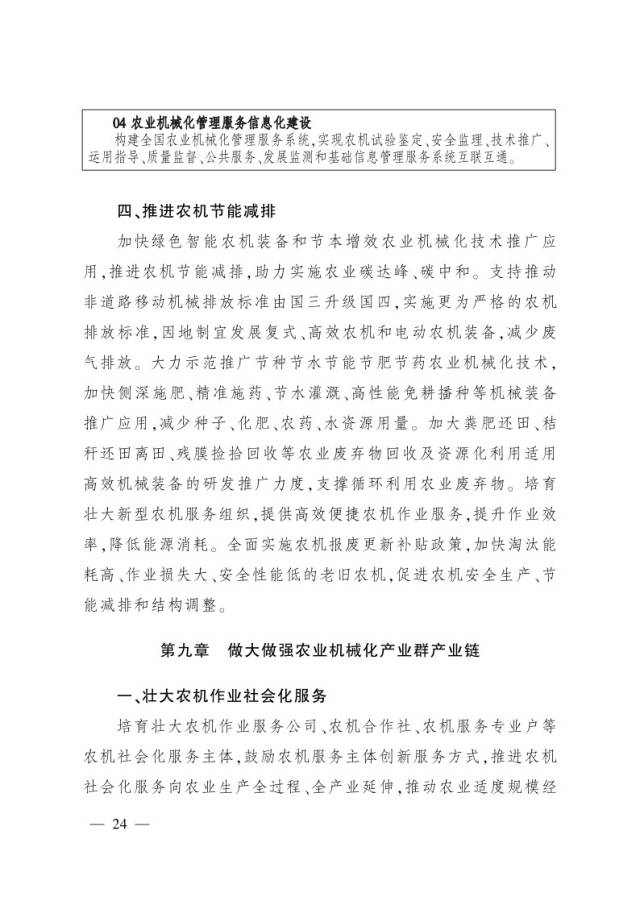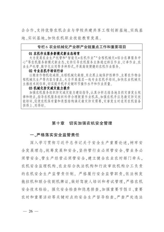 《规划》指出,我国农业生产已从主要依靠人力畜力转向主要依靠机械动力,进入了机械化为主导的新时期。“十四五”时期,三农工作进入全面推进乡村振兴、加快农业农村现代化的新阶段,对农业机械化提出了新的更为迫切的要求,也为农业机械化带来了新的发展机遇。要深入推进农业机械化供给侧结构性改革,着力补短板、强弱项、促协调,大力推动机械化与农艺制度、智能信息技术、农业经营方式、农田建设相融合相适应,引领推动农机装备创新发展,做大做强农业机械化产业群产业链,加快推进农业机械化向全程全面高质高效发展。