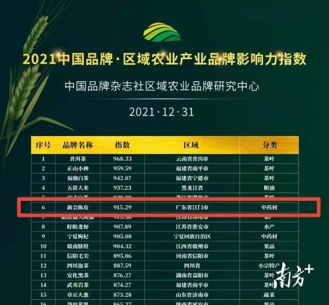 “强化品牌意识 推动乡村振兴”。近日,由《中国品牌》杂志社、中国品牌网主办的2021中国区域农业品牌发展论坛暨2021中国区域农业品牌年度盛典系列活动在京举行。在活动发布的“2021中国品牌·区域农业产业品牌影响力指数”中,广东省共有四个区域品牌入围,其中新会陈皮高居全省第一、全国第六,连续四年入围该榜单,同时也蝉联中药材品类榜首。