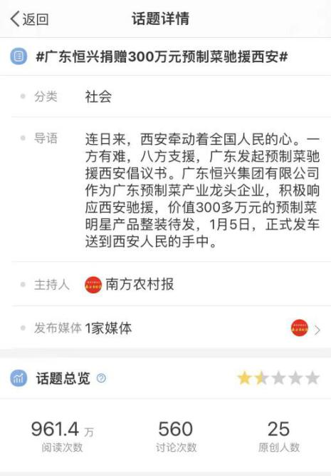 微博官方、微博大V纷纷发文,#广东恒兴捐赠300万元预制菜驰援西安#的话题阅读量已达961.4万人次。在恒兴集团的义举后,已有20多家广东企业派出爱心专车陆续出发西安,捐赠超过700万元的预制菜等产品。
