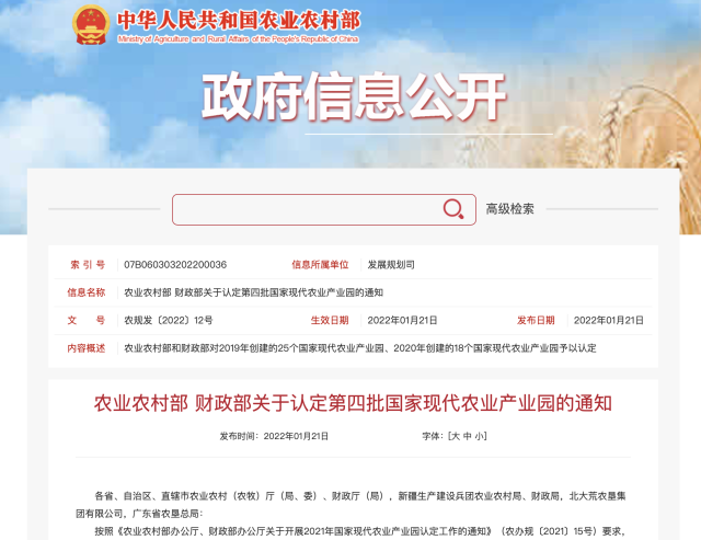 近日,农业农村部和财政部正式印发《农业农村部、财政部关于认定第四批国家现代农业产业园的通知》(农规发〔2022〕12号)。通知显示,经产业园所在地政府申请、省级农业农村和财政部门审核推荐、专家评审和公示等程序,农业农村部和财政部对2019年创建的新疆维吾尔自治区博乐市等25个国家现代农业产业园、2020年创建的广东省广州市从化区等18个国家现代农业产业园予以认定。