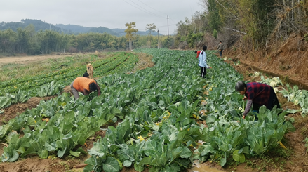 2021年为扎实做好冬种生产,义合镇上屯村村支书苏道山针对50亩撂荒耕地,团结村民们一起讨论与思考。在商量之后,确定种植冬种蔬菜,选择了花椰菜、西兰花、竹筒青白菜、卷心白菜共四个品种,联合云南种菜专业户技术指导,从整地施肥、水分供给、光照补充、虫害防治到配方施肥等,全程组织华南农业大学相关专业的教授与农艺师进行技术帮服。蔬菜具备两个优势:一是使用优质东江水人工灌溉,精心呵护每棵菜的成长。二是采用生物防治技术,绿色健康安全,消费者吃得更放心。