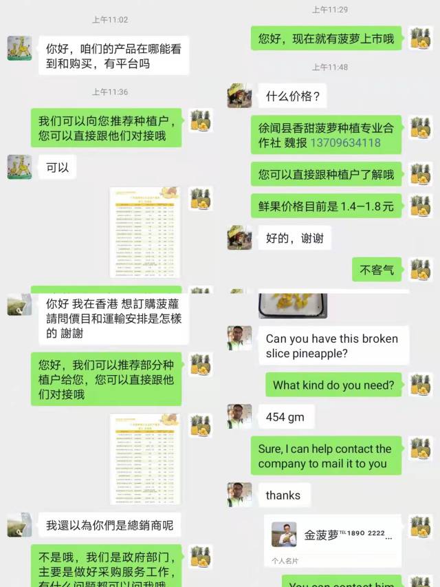 “24小时内,已经有79个采购商加为好友,除了广东、山东、湖南、香港等国内采购商外,还有印度采购商。”徐闻县农业农村局市场信息与交流合作股股长田绿苗是该服务热线的运营人,该服务热线24小时以来咨询菠萝的信息一直持续。