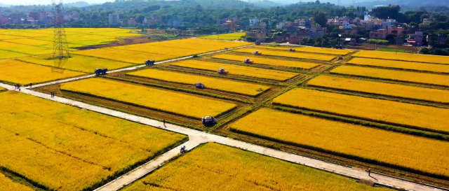 江门市台山市海宴镇,稻浪金黄,一派鱼米之乡的丰收景象。(张小玲供图)