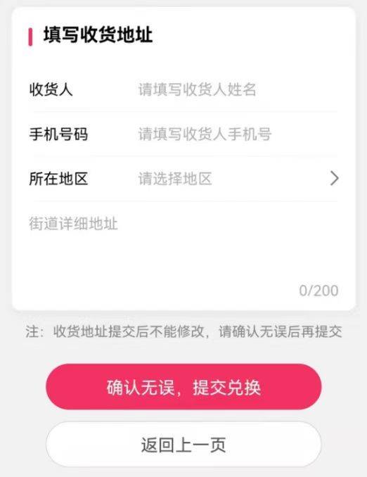 点击“兑奖”进入填写收货地址页面,填报信息无误后按“提交兑换”