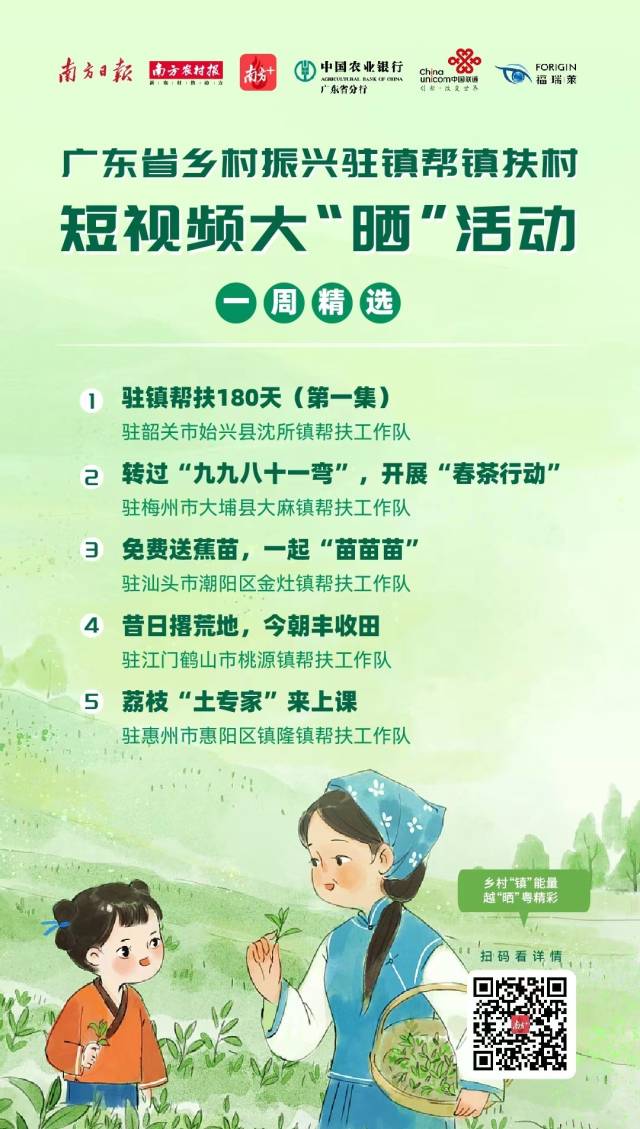 以“乡村‘镇’能量,越‘晒’粤精彩”为主题的广东省乡村振兴驻镇帮镇扶村短视频大“晒”活动于2022年2月全面启动。活动在南方+APP开辟专区,鼓励各驻镇帮扶工作队比“晒”行动做法、成效亮点、实事好事。主办方每周将精选出部分优秀参“晒”作品进行展播。无论是晒工作经验做法,还是秀驻镇风采人物趣事,均有机会上榜驻镇帮镇扶村短视频大“晒”一周精选,敬请垂注!