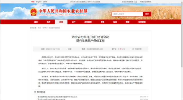 3月22日,农业农村部在京召开部门协调会议,分析当前生猪生产形势,研究稳定生猪生产措施。农业农村部副部长马有祥主持会议并讲话,发展改革委等7部门有关司局负责同志参加会议。