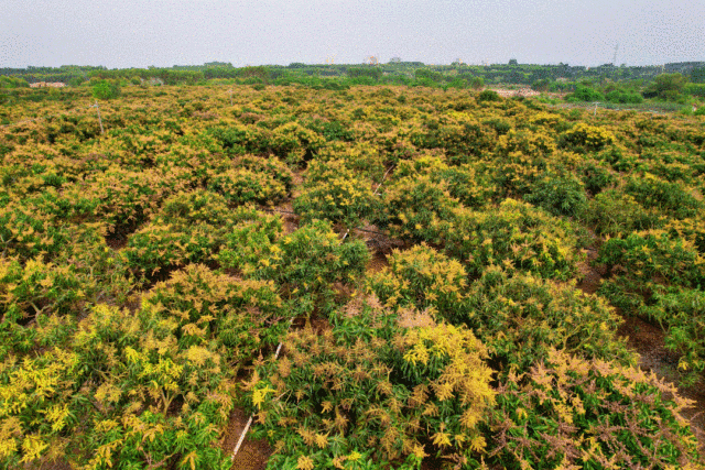其中,芒果花吸引了记者的关注。与春季阳光相称的淡黄色,配上精致温婉的外形,随着微风拂过,花海起伏,蔚为壮观。