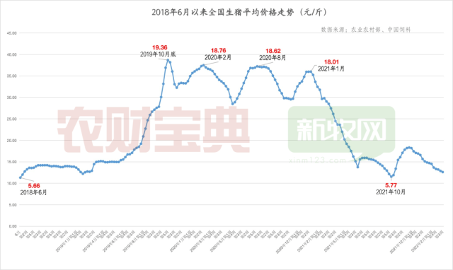 本轮猪周期区间为2018年5月至今,猪价于2020年8月到达最高峰,价格为18.58元/斤(此数据为月均价,而上文中是周均价,因此在最高峰时,呈现的价格和时间均有所差异)。