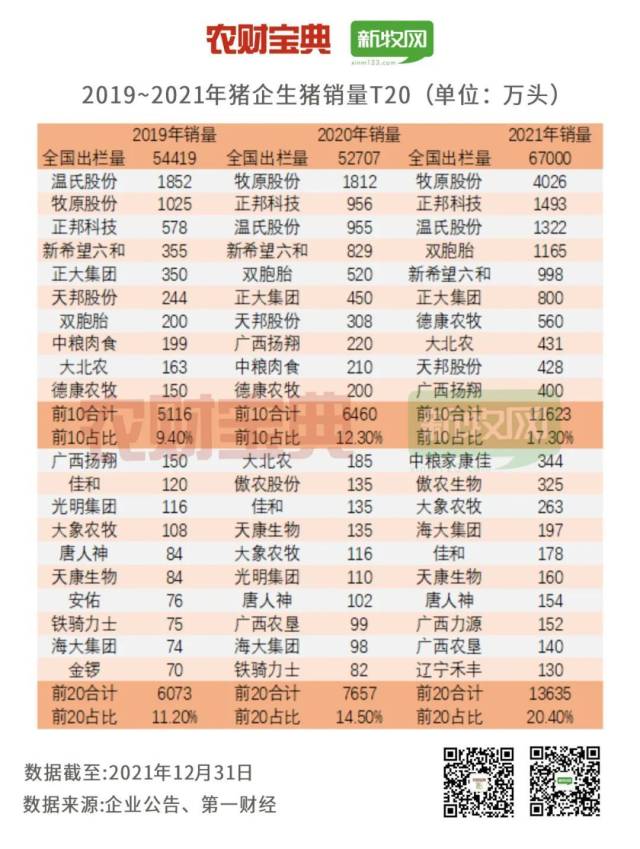 重庆一家存栏三四千头左右母猪规模的猪场负责人也判断,猪价在今年下半年会有所回升。“主要还是看未来集团猪场的走势和战略,如果继续扩张,可能猪价不会涨到太高;如果有序扩张,猪价可能还会维稳。”经《农财宝典》新牧网记者统计,2019年—2021年,我国生猪销量前20强的养猪企业占比已从11.20%提升到了20.40%。