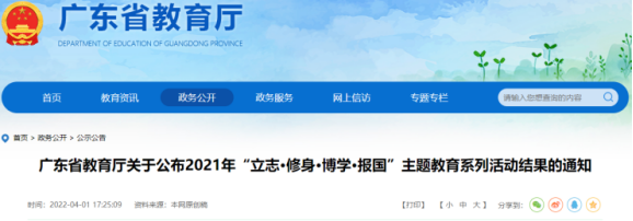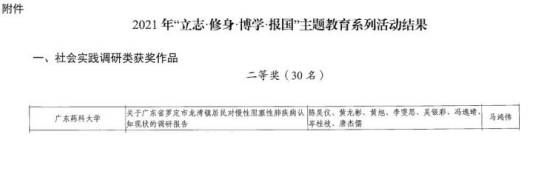 4月1日,随着广东省教育厅关于2021年“立志·修身·博学·报国”主题教育系列活动获奖名单公布,广东药科大学派驻云浮罗定市龙湾镇乡村振兴驻镇帮镇扶村工作队获省级评审专家组肯定——《关于广东省罗定市龙湾镇居民对慢性阻塞性肺疾病认知现状的调研报告》喜获二等奖。