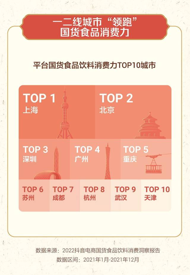 在城市消费力上,报告披露,一二线城市“领跑”国货食品消费力。数据显示,上海、北京、深圳、广州、重庆、苏州、成都、杭州、武汉、天津成为平台国货食品消费力城市排名前十位。