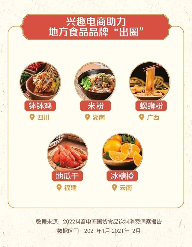在兴趣电商助力下,地方国货食品品牌“出圈”,受到消费者喜爱。如四川钵钵鸡、湖南米粉、广西螺蛳粉、福建地瓜干、云南冰糖橙等商品受到各地消费者认可。
