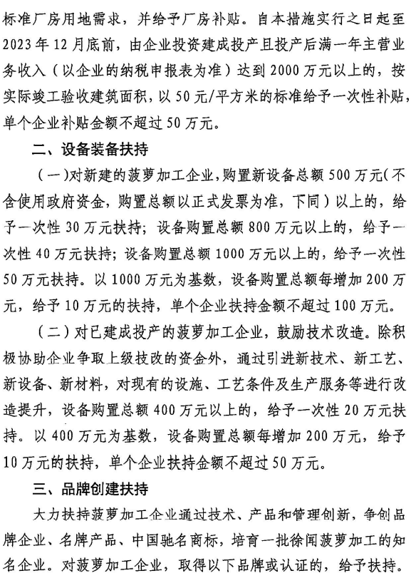 为促进菠萝一二三产业融合发展,做大做强徐闻菠萝产业,振兴徐闻乡村经济,4月6日,徐闻县委县政府发布2022年一号文件——《徐闻县促进菠萝加工业发展的十条措施》(以下简称《徐闻菠萝加工十条》)。结合徐闻县实际情况,对在徐闻县内设立的菠萝加工企业,给予相关扶持和奖励。