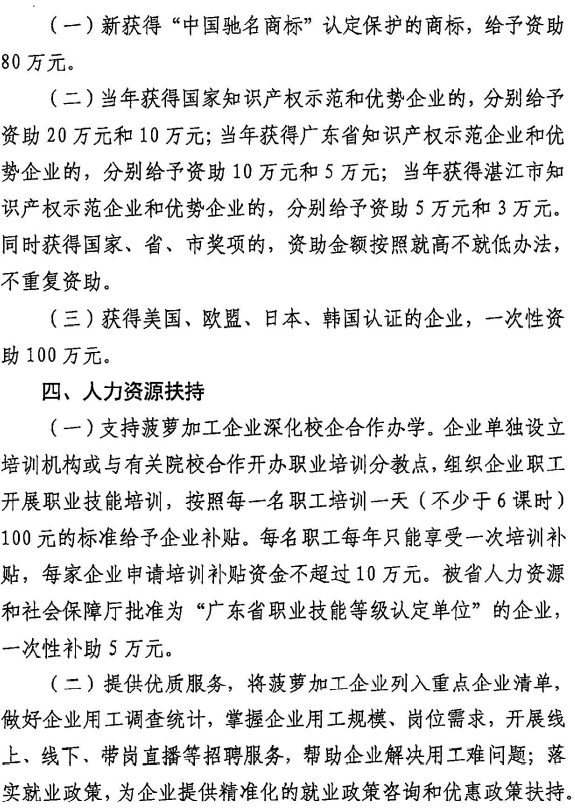 《徐闻菠萝加工十条》表示,将对徐闻县内设立的菠萝加工企业给予用地保障和厂房、设备装备、品牌创建、人力资源、原材料供应、行政服务、金融服务、供水供电、科研、出口等十方面的扶持。
