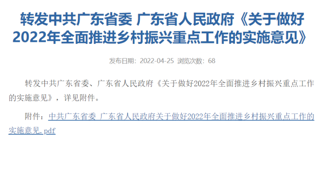 为贯彻落实《中共中央 国务院关于做好2022年全面推进乡村振兴重点工作的意见》精神,切实做好广东省2022年全面推进乡村振兴各项工作,确保农业稳产增产、农民稳步增收、农村稳定安宁,近日,中共广东省委 广东省人民政府《关于做好2022年全面推进乡村振兴重点工作的实施意见》(以下简称《实施意见》)发布。