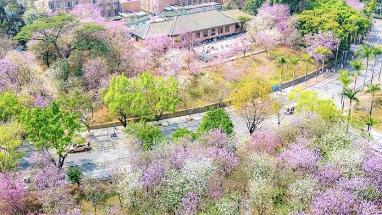 每年3月,在天适樱花悠乐园里,广州樱、福禄寿、貂蝉等品种樱花盛放。
