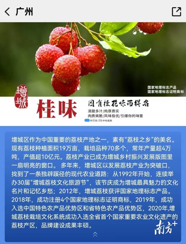 据悉,增城荔枝以美味闻名岭南荔枝产区,以底蕴蜚声世界荔枝文化圈。如今,增城桂味、增城仙进奉、增城水晶球、增城糯米滋以“增城荔枝”之名,成为与增城挂绿齐名的双地标品牌,尤其增城荔枝荣列去年中国国家地理标志声誉(水果类)百强榜,且夺全国荔枝类品牌桂冠;与此同时,增城荔枝种植文化入选首批岭南荔枝种植体系,增城更以遍地荔枝成为中国重要农业文化遗产地。