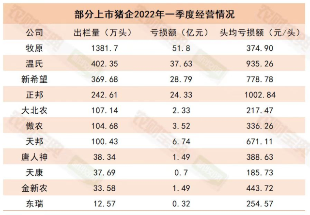 快速出栏抢占市场的背后,亏损惨烈也是事实。根据牧原一季度报显示,2022年一季度亏损51.8亿元,接近2021全年利润的75%!同时,牧原4月份销售生猪632.1万头,商品猪销售均价12.56元/公斤,以16元/公斤的造肉成本、110公斤出栏均重为基础粗略计算,每头猪将亏损378.4元!