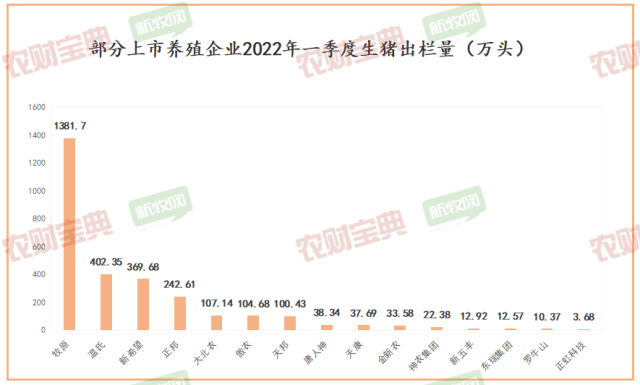 当中,牧原一季度出栏1381.7万头一马当先,紧随其后的温氏、新希望和正邦一季度的累计出栏量分别超过了400万、300万和200万头。一季度出栏超过100万头的企业还有大北农、傲农、天邦。
