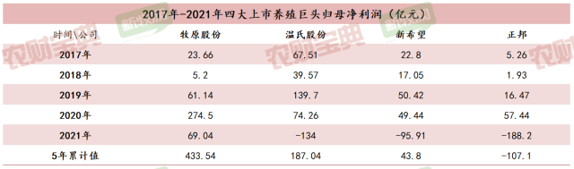 据《农财宝典》新牧网记者统计,从归母净利润的维度看,虽然2021年大多养猪企业都深度亏损,但从过去5年的合计数据看,四大巨头中牧原、温氏、新希望依然能保持盈利,其中牧原和温氏的5年累计归母净利润都超过了100亿元。而正邦被2021年的业绩拖累比较明显,合计归母净利润出现了亏损。
