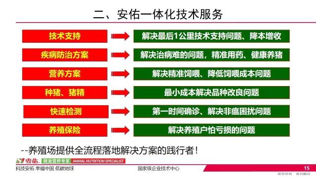 “未来养殖行业以规模集约化企业和家庭农场两大养殖模式为主,前者拥有资金、技术、硬件、管理等优势,这是家庭农场养殖的短板。”安佑集团技术服务总监任庆海表示,安佑一体化技术服务通过建立技术服务站整合资源,弥补家庭农场在技术、硬件、管理等方面的不足。