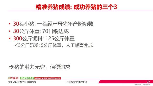 “在精准营养上,安佑做到具体化、标准化。”洪平表示,安佑精准营养体现为六大方面,包括配方精准计算、无抗饲料实现替抗精准、多配方分析实现经营精准、多维度指标实现农场精准营养、生态的精准、数字化及智能化的精准。