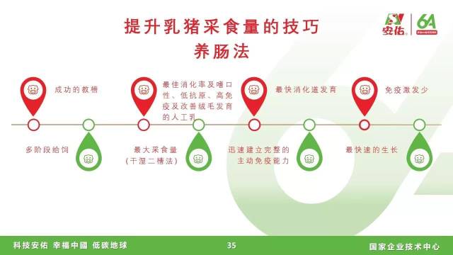 养肠法的重点是多阶段给饲。刘春雪谈到,养肠法主要可以分为三个阶段:一是哺乳期采取人工哺育法;二是离乳前采用色牌教槽法,在乳猪10-14日龄挂红牌,15-21日龄挂黄牌,21-28日龄挂绿牌,从红牌到绿牌教槽料用量逐渐提高;三是离乳后采取干湿二槽法,在断奶后的5-10天,湿槽和干槽混喂。