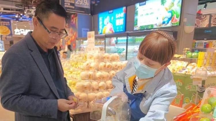 5月11日上午,一盒盒鲜切菠萝整齐上架智检小站-助农优品体验柜,迅速引来消费者围观,不到1个小时,不少体验柜的鲜切菠萝已全部被领取。