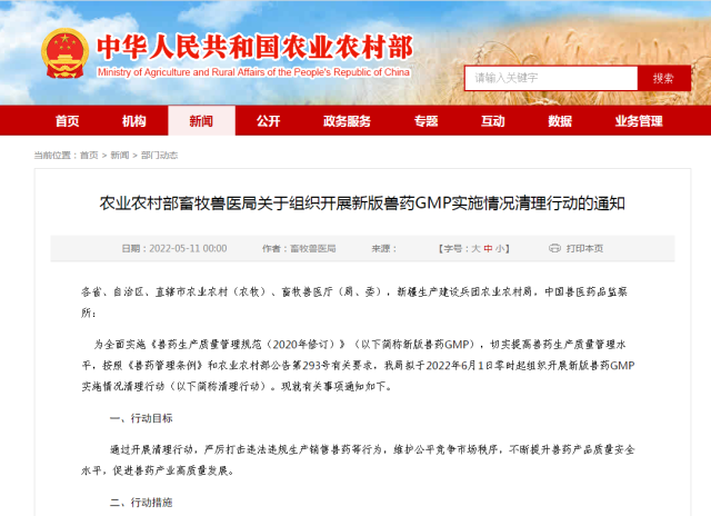 5月11日,农业农村部畜牧兽医局发布《关于组织开展新版兽药GMP实施情况清理行动的通知》。通知中提出,截止2022年6月1日零时未通过新版兽药GMP检查验收的兽药企业一律停止兽药生产活动。