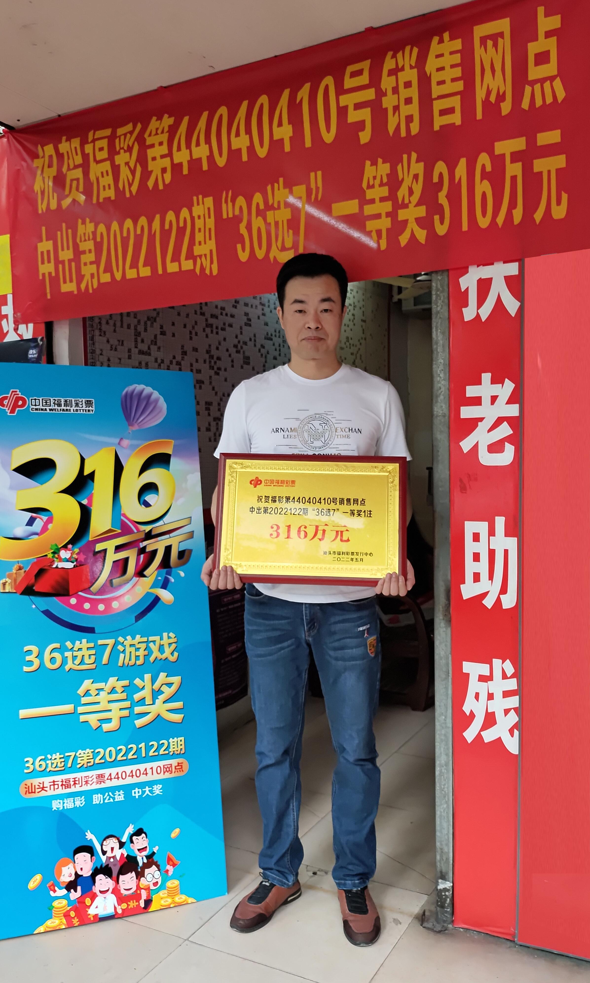南方农村报讯 (通讯员袁欣)5月27日上午,汕头福彩中心工作人员来到位于汕头市金平区金新路84号第44040410号销售网点,为中出南粤风采“36选7”一等奖316万元站点颁发荣誉牌匾,并奖励该网点负责人3000元、销售员2000元奖金(如图)。