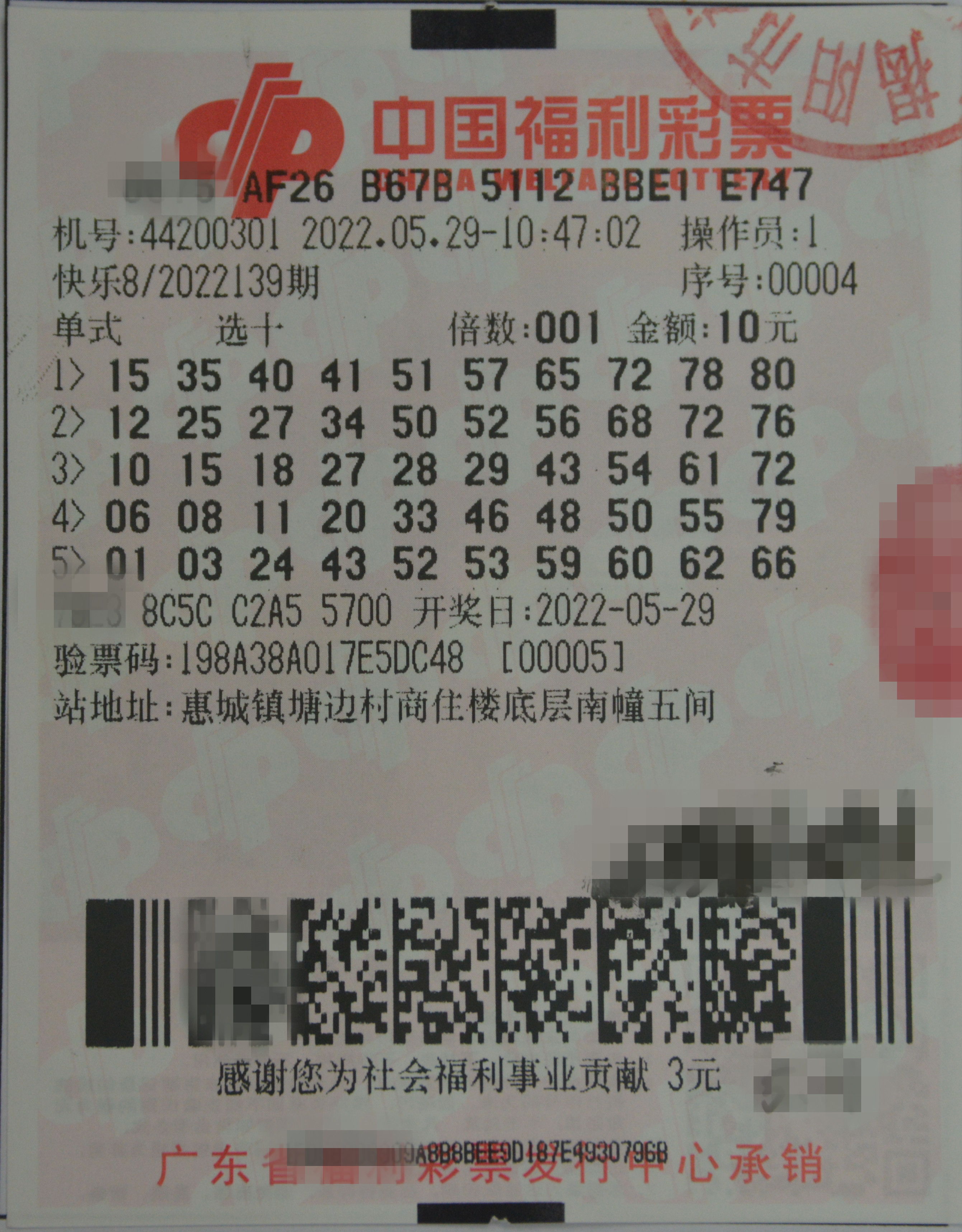 开奖第二天,中奖者现身兑奖,是揭阳本地人。年轻的女彩民李女士(化姓)购买的是一张10元5注自选单式票,中奖投注站位于惠来县惠城镇塘边村商数楼底层的44200301投注站。
