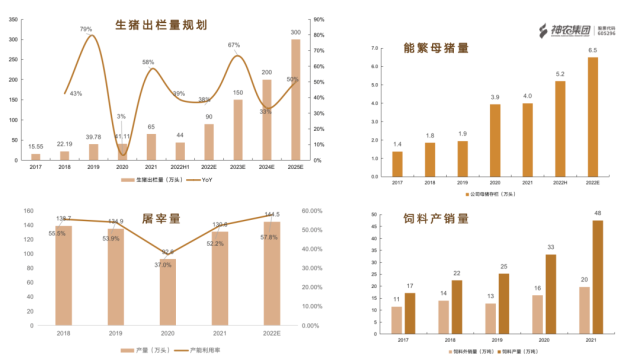 养殖板块:2022年生猪出栏预计超过90万头,2023年、2024年、2025年规划生猪目标出栏分别为150万头、200万头、300万头。蒋宏表示,为保证2023年150万头出栏目标的实现,2022年年底公司能繁母猪计划扩充到6.5万头;此外,为保证2025年300万的出栏量,今明两年神农集团将增加10万头母猪,资产投资约为13亿元。