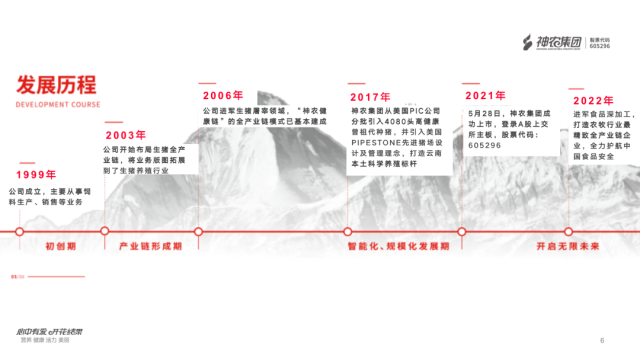 一路走来,神农集团似乎每一步都走得很稳健。1999年以饲料起家;2003年将业务版图拓展到生猪养猪行业;2006年进军生猪屠宰领域;2017年起分批引进美国PIC4080头曾祖代种猪,并引入美国PIPESTONE先进猪场设计及管理理念,开启智能化、规模化发展;2021年5月28日登陆A股上交所主板成功上市;2022年进军食品深加工。在蒋宏看来,神农集团未来也将开启无限可能。