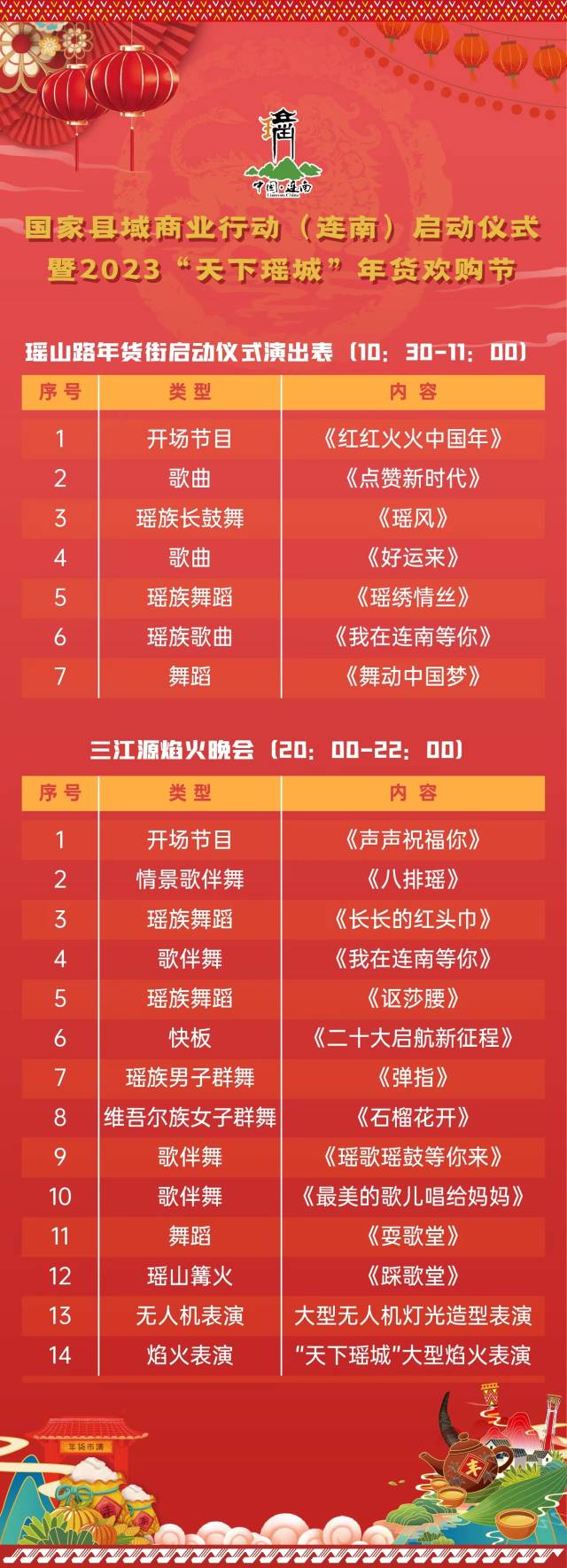 同时,连南年货节还将融入瑶族山歌、长鼓舞、舞狮、现场书法等表演,向外来游客宣传本地特色瑶族文化,吸引更多外地消费者。其中,1月15日至20日在“年货街”主舞台轮番上演传统舞狮表演、送春联等各式迎春节目;1月15日当天,连南年货节启动仪式欢乐启幕,连南利通㕱嗨欢乐世界同步开园,晚间还将在三江源上演瑶族特色歌舞表演、无人机表演、烟花汇演、瑶山篝火晚会等活动,浓浓年味扑面而来,重“燃”生活烟火气。