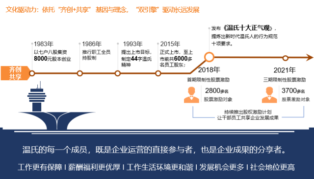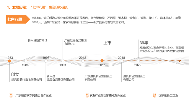 回顾温氏发展历史,1983年,温氏创始人温北英乘着改革开放春风,联合“七户八股”集资8000元,创办广东省第一家农民股份合作企业——新兴县簕竹畜牧联营公司,也就是如今温氏股份的前身,39年来温氏已发展成为以畜禽养殖为主业、配套相关业务全国布局的现代农牧食品集团。