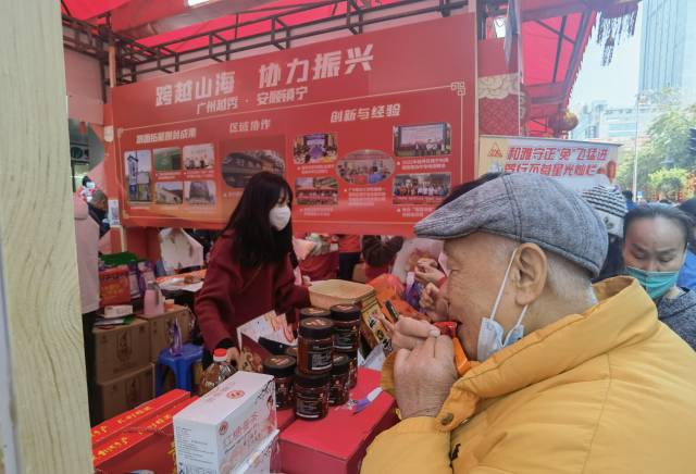 摊位负责人介绍,从镇宁带来的蜂糖李干、百香果干、红糖姜茶等特色农品一上架,就受到了广州市民的欢迎,摊位上还通过照片展示了越秀区帮扶贵州的成果。摊位展示时间自1月19日至1月21日(每天9:00-22:00)共3天。